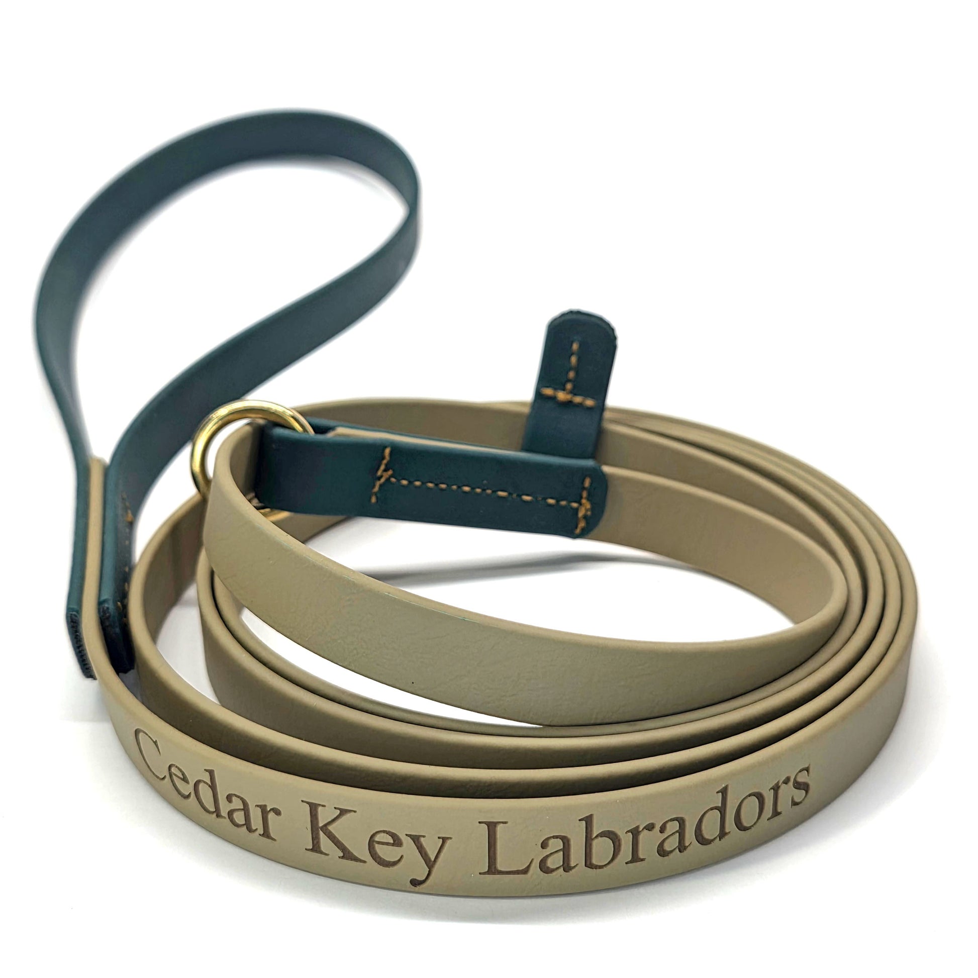 Going to the Potomac in April? Here is a special way to commemorate the trip to the largest Labrador show in the World! This slip lead is made with Emerald Green and Tan authentic USA made BioThane®, brass hardware and sewn with our signature Golden Brown UV resistant bonded polyester thread. Laser engraved with "The Potomac 2026" on one side, and if preordered, your dog or kennel name on the other.